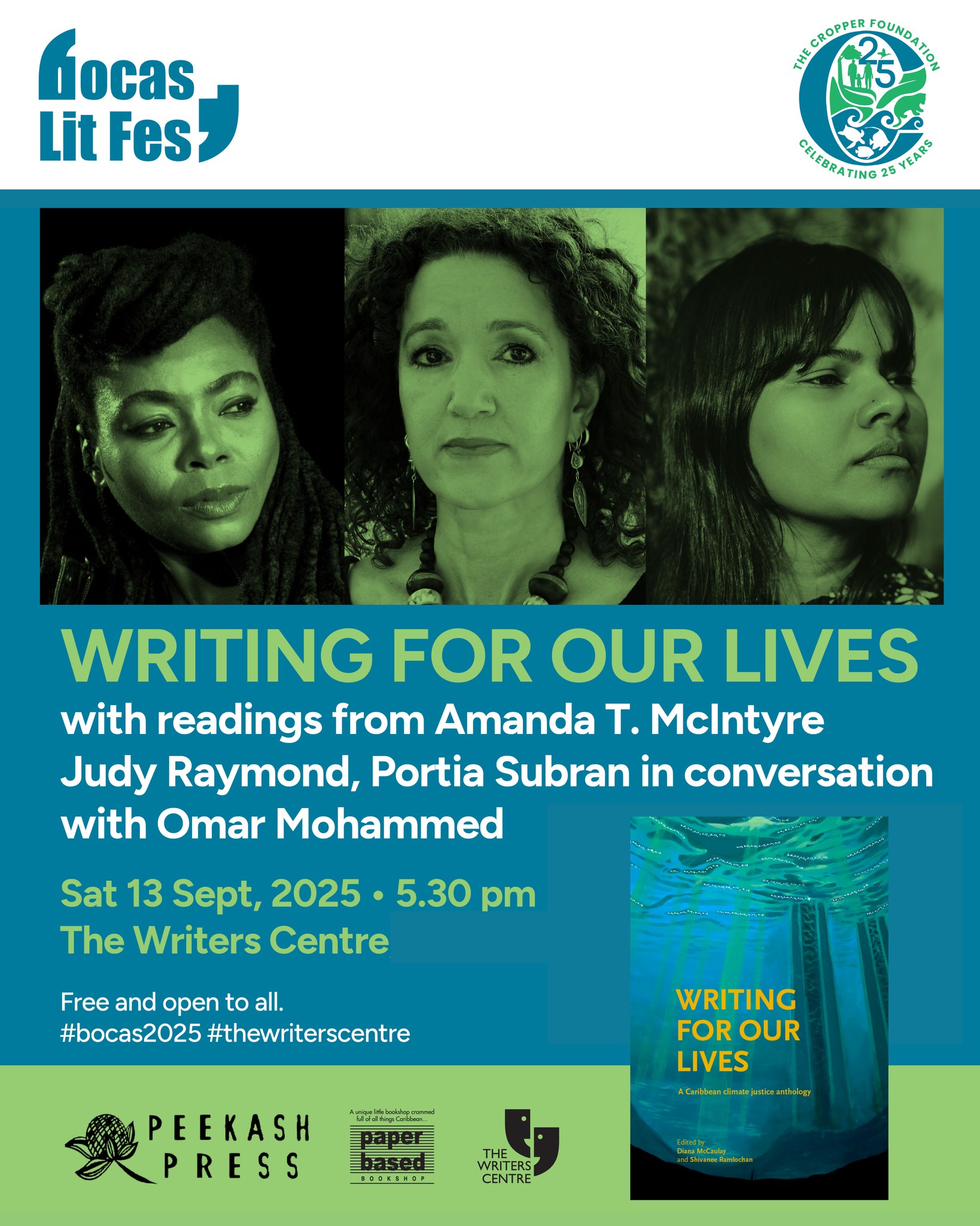 Writing For Our Lives, an anthology of climate justice featuring 18 established and emerging writers from eight Caribbean territories, will be celebrated at The Writers Centre on Saturday, September 13, at 5.30 pm. Three of the anthology’s T&T contributors —Amanda T McIntyre, Portia Subran, and Judy Raymond—will read from their pieces in Writing For Our Lives, then join Omar Mohammed, author of the anthology’s afterword and former CEO of The Cropper Foundation, for a wide-ranging discussion.