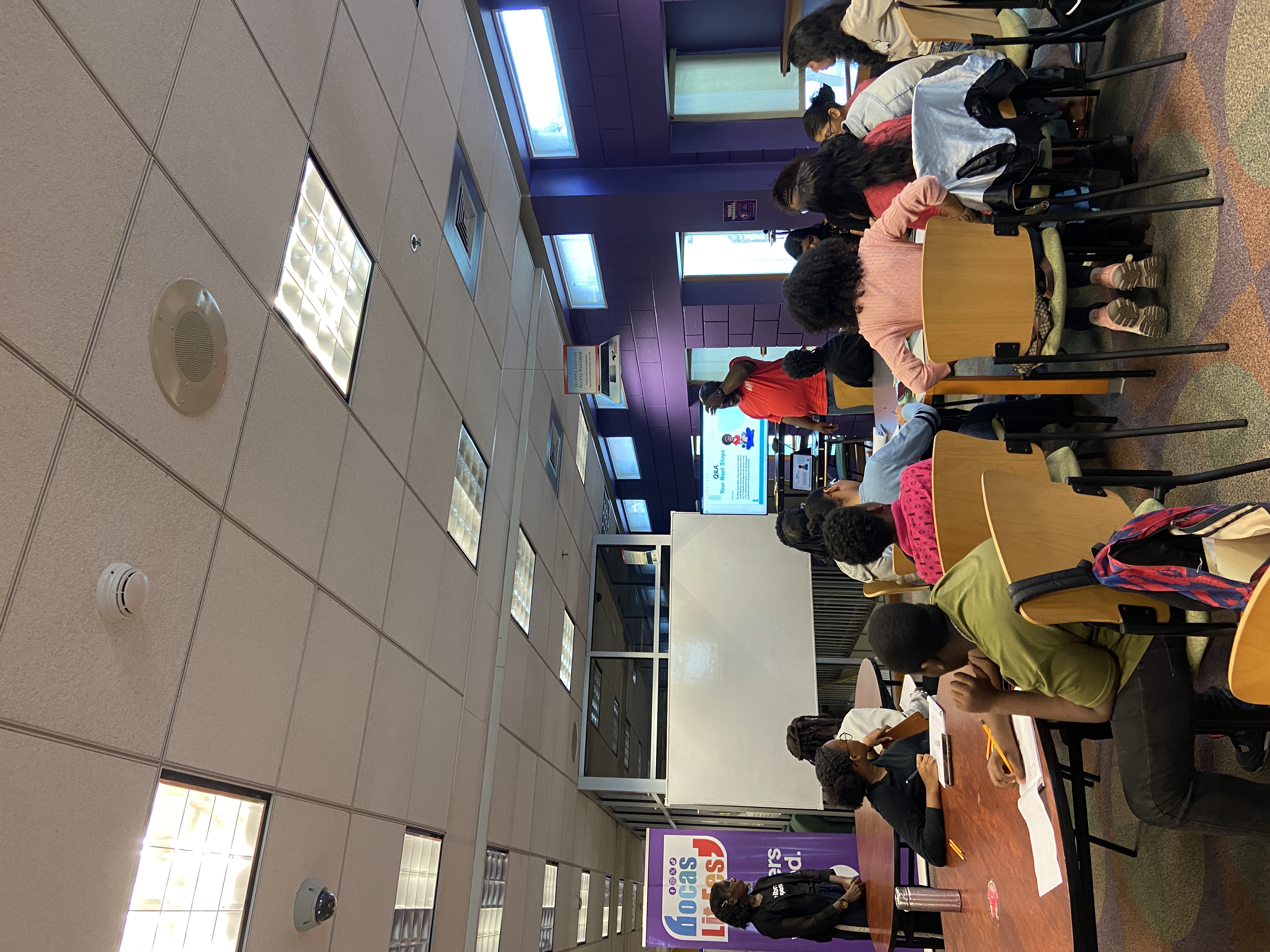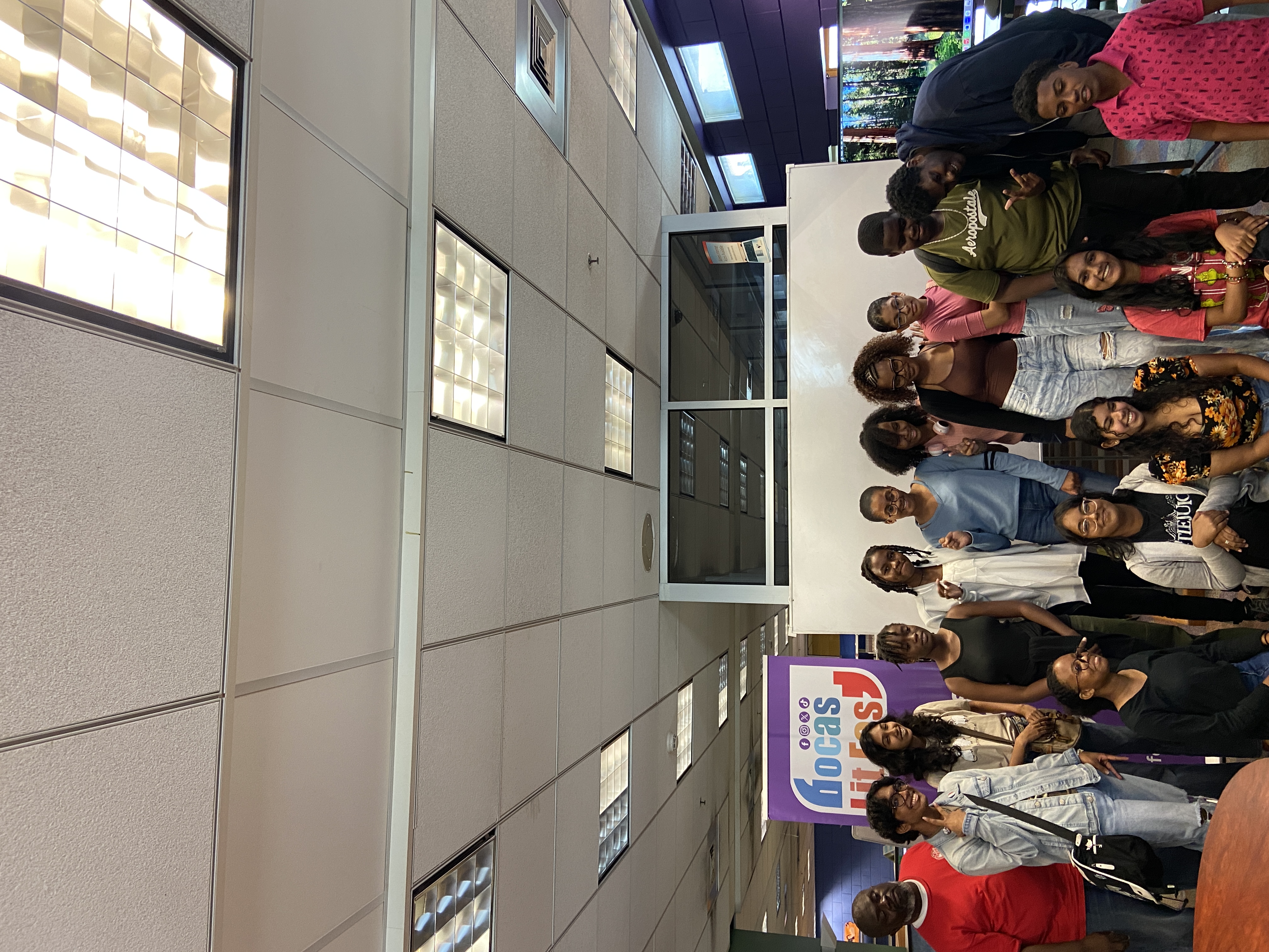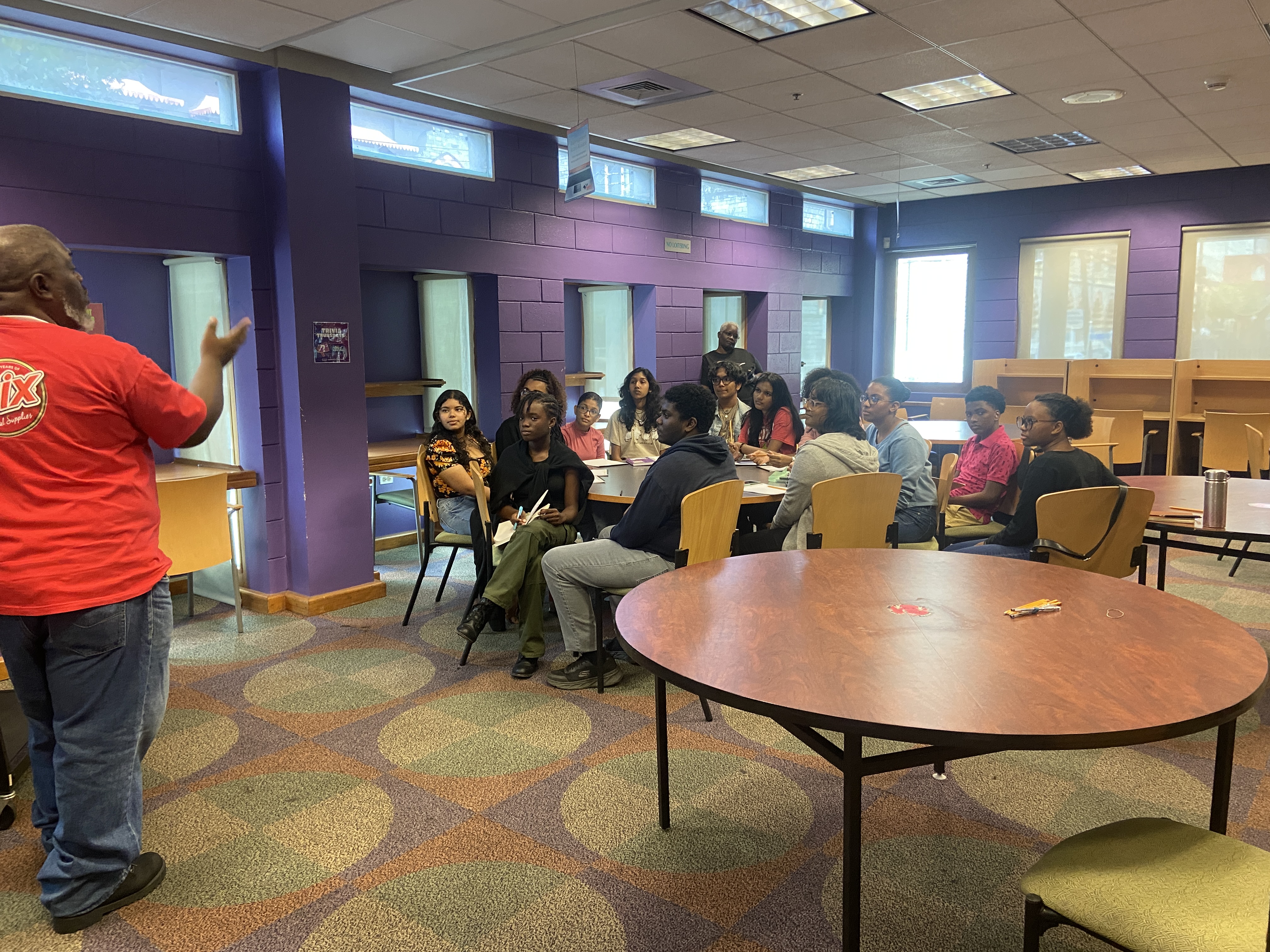 Pictured here are Caiden Francis, Alicel Ram, Amoy-Marie Lee-pow, Aijalon Best, Mikhaela Browne, Angela Daniel-Honoré, Neeval Moosai, Sabella Paul, Jessica Balroop, Ethan Phillip, Kaeda Ramnarine, Hailey Lakatoo, Amara Chadee, Naiesha Bhagaloo, and Maria Martinez from T&T with workshop facilitator and creative consultant for the project Everard McBain, at their first in-person session at National Library and Information System Authority – NALIS.