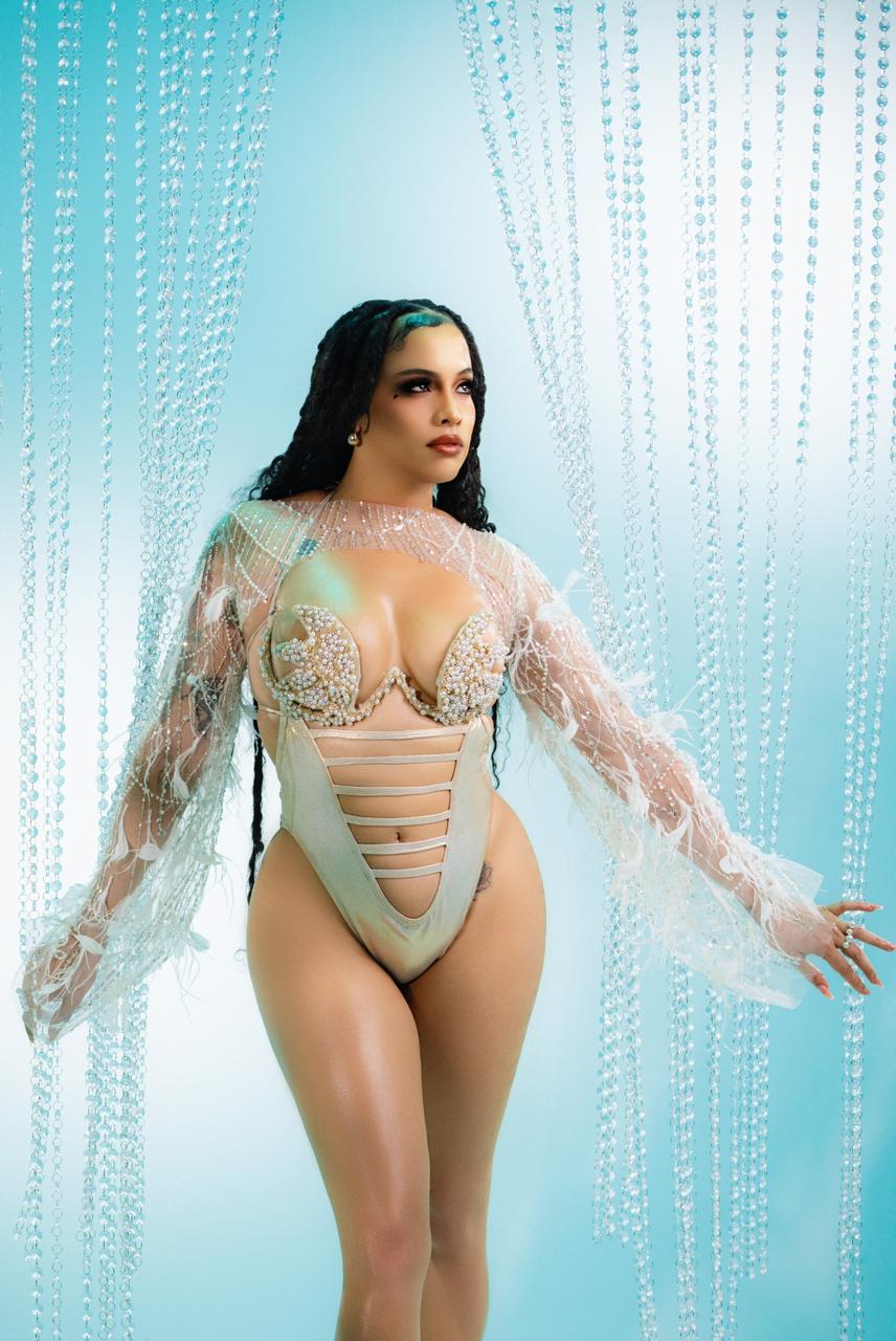 Since her breakout hit, “Tingo”, in 2018, she has existed on the edge of the soca industry and become known for her fashion-forward looks, outspoken demeanour, and her hybrid artistic ability to blend soca, dancehall and hip-hop. For the Carnival, she is rocking Aria Applewhite Monday wear.