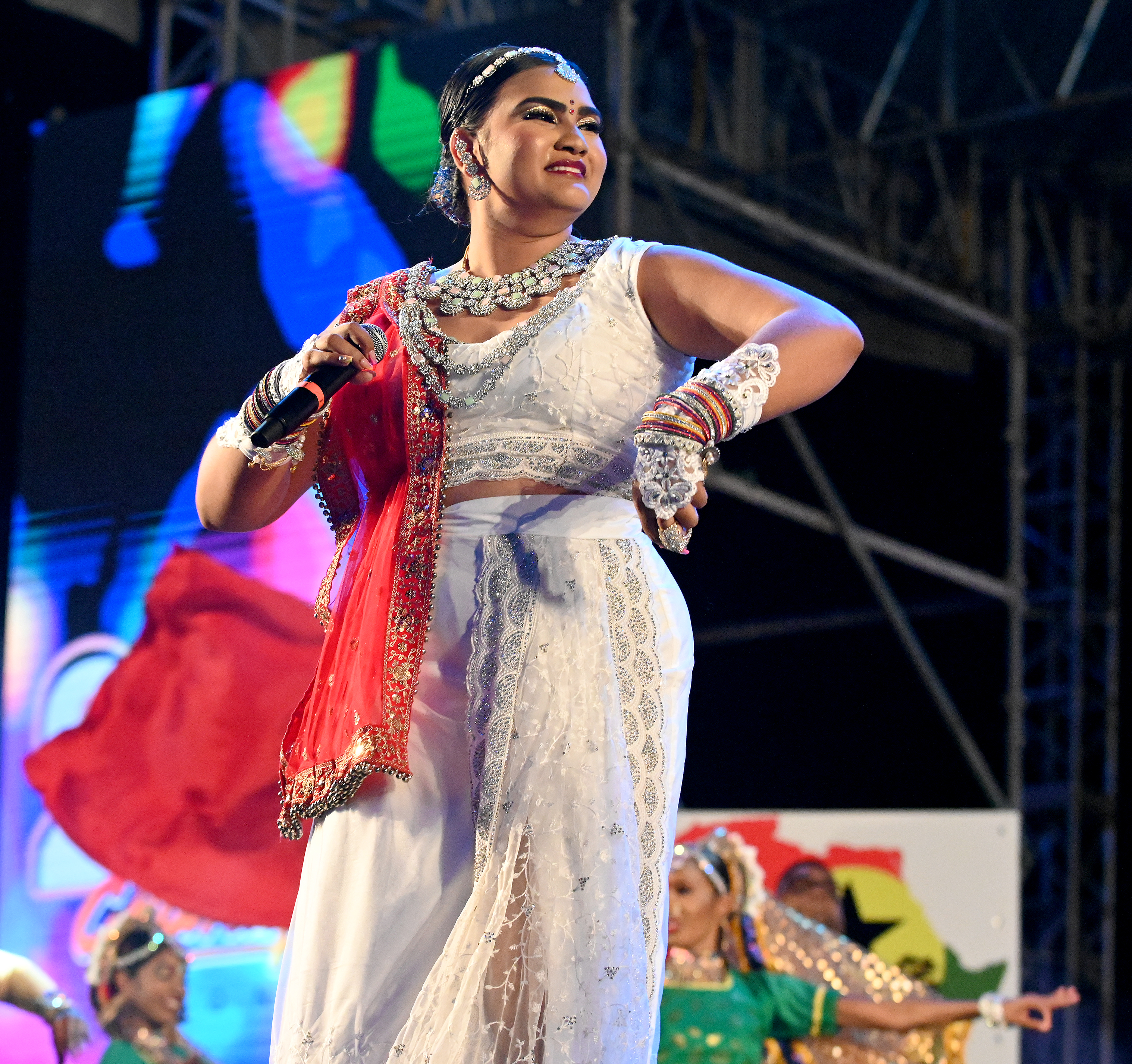Among the most anticipated acts was Rasika “D Rani” Dindial, who captivated the audience with a vibrant rendition of her hit song “Pong D Damadol.” Dressed in elegant traditional Indian wear, the newly crowned Traditional Monarch winner had the audience singing along to every refrain, proving once again why she remains a crowd favourite.