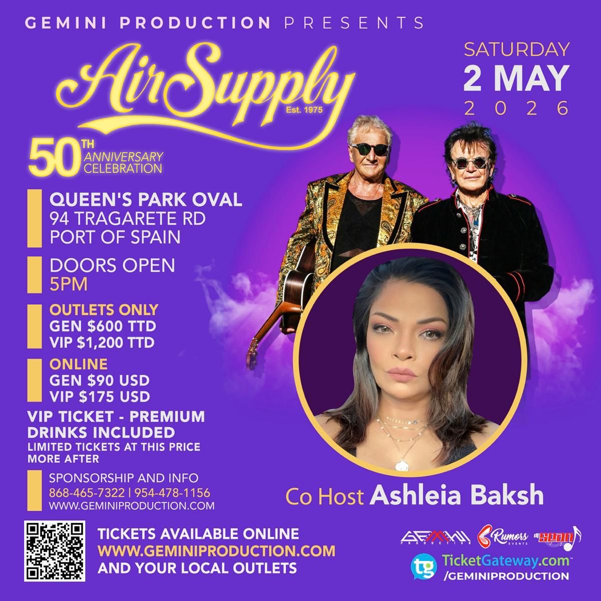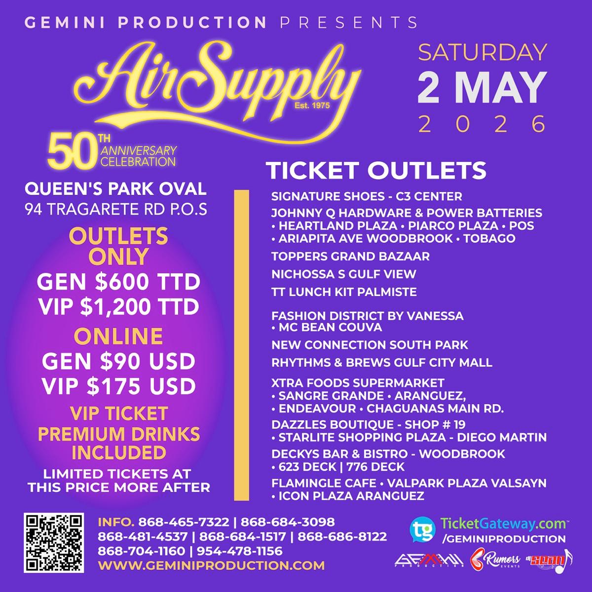 Set for Saturday, May 2, 2026, at the iconic Queen’s Park Oval in Port of Spain, the concert will see gates opening from 5:00 PM, allowing patrons to soak in the ambiance before the magic unfolds. With co-host Ashleia Baksh helping to guide the evening, the event promises a polished and engaging experience. Known for global hits like “All Out of Love” and “Making Love Out of Nothing at All,” Air Supply’s return is expected to draw a wide cross-section of fans ready to relive the golden era of love ballads under the Caribbean sky.